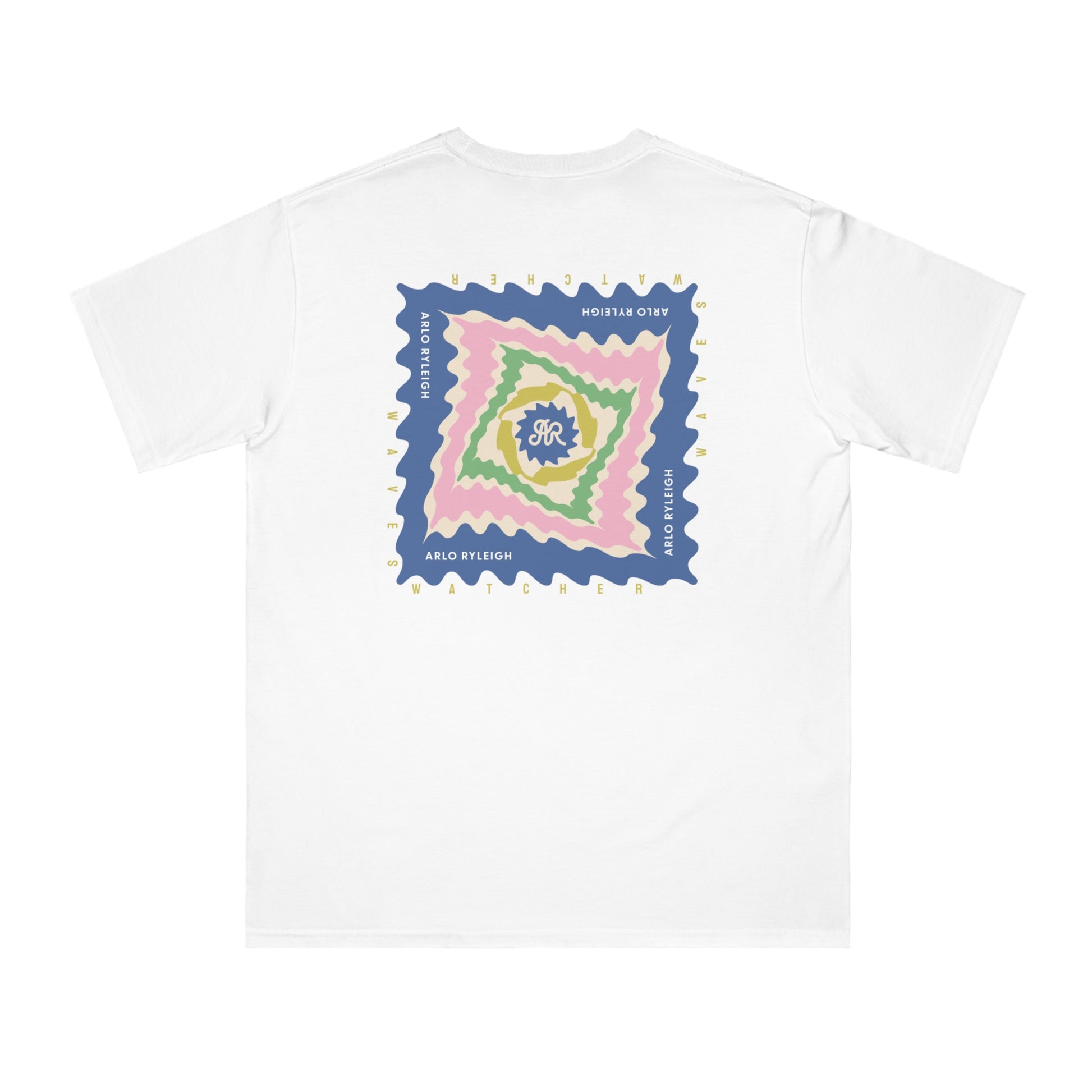 Ride the rhythm of color and motion. The Waves Watcher Tee features a bold back print with rippling, wavy layers of pastel tones, a nod to the movement and calm of coastal days. A matching mini print hits the front chest for a balanced, laid-back look.